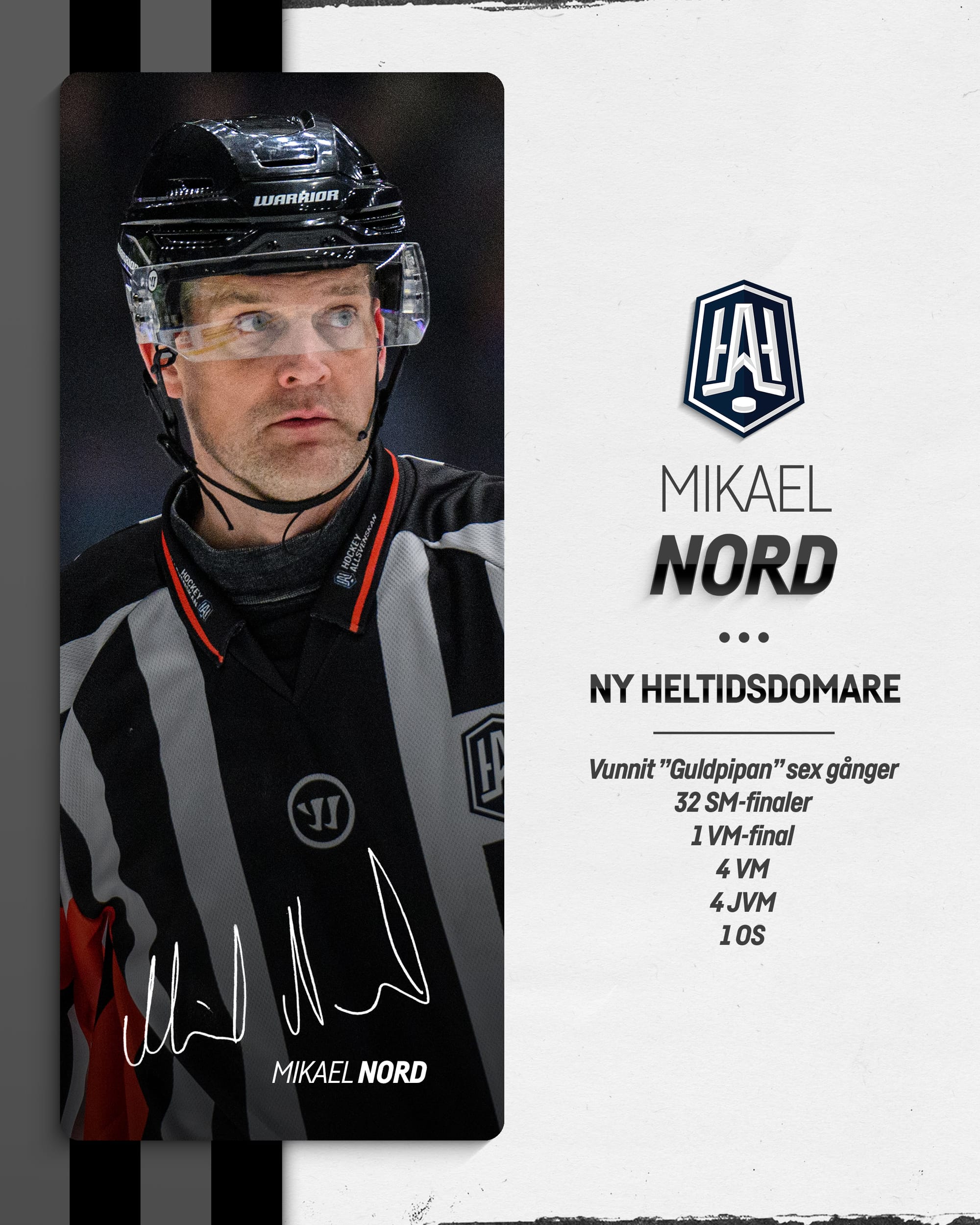 – Förutom att han kommer att döma matcher precis som alla andra domare, så kommer Micke att jobba i en mentorsroll och bistå med sin kunskap och erfarenhet för att utveckla nästa generation ishockeydomare. Jag har svårt att föreställa mig en bättre ambassadör för domaryrket än Mikael Nord och jag både stolt och glad över att få se honom i en HA-tröja till hösten, säger HockeyAllsvenskans domarchef Björn Wettergren.